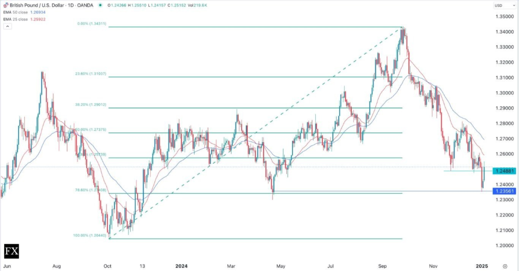 - Rebound from Key Level: The GBP/USD found support at 1.2355, coinciding with the 78.6% Fibonacci retracement level. It has since moved above a previous support level at 1.2488.