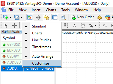 Drawing support and resistance zones in MT4 is easy, though you will have to make a quick customization to your standard toolbar. Simple right-click your standard charting toolbar and click ‘Customize’: